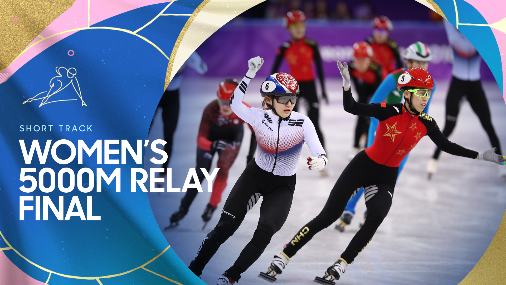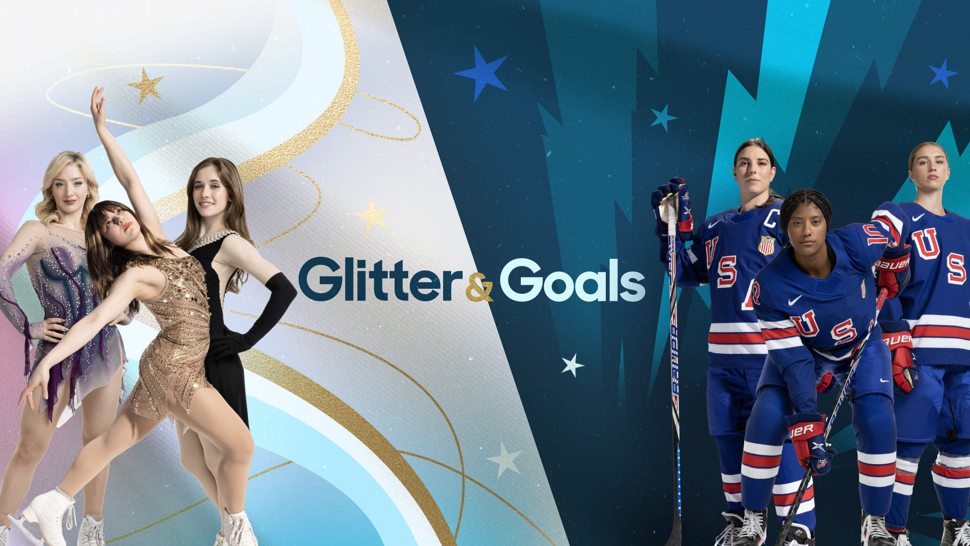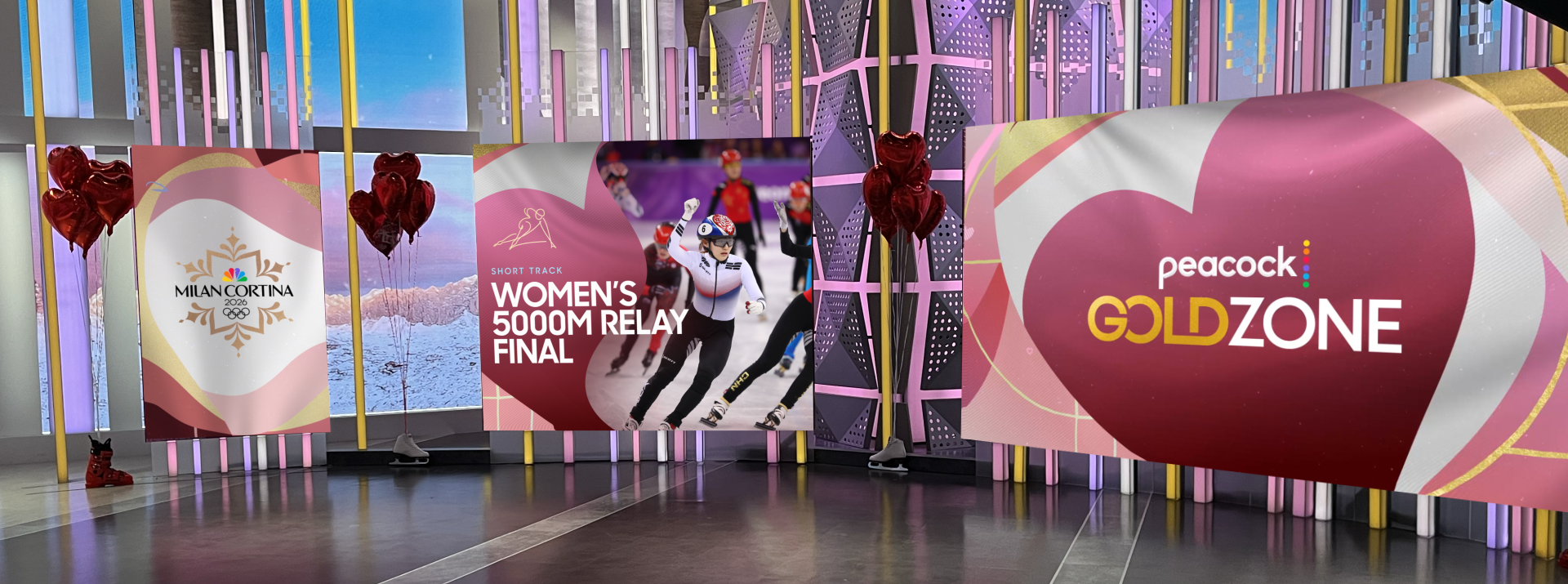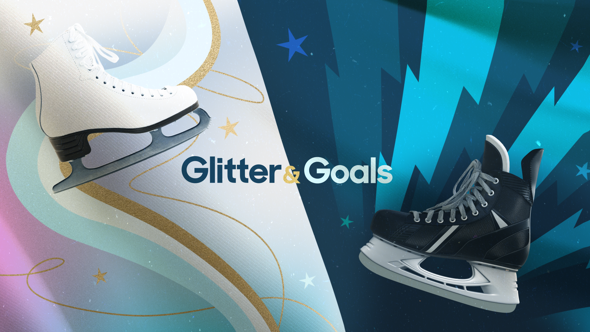 “Glitter & Goals” was a studio takeover highlighting two major events of the day: women’s hockey and figure skating. This presented the unique challenge of designing two distinct looks that each felt like their own world while maintaining a cohesive visual identity aligned with Gold Zone’s branding. Sam Pickett developed a striking lightning bolt motif, which I contrasted with delicate swirls inspired by the movement of figure skating to create visual distinction between the two sports.